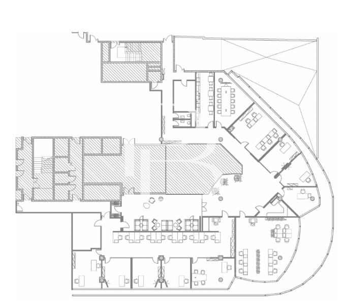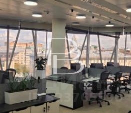 Площадь офисного помещения составляет 937 кв.м., где стойка ресепшн, 10 кабинетов, 1 переговорная, 34 рабочих мест, кухня.