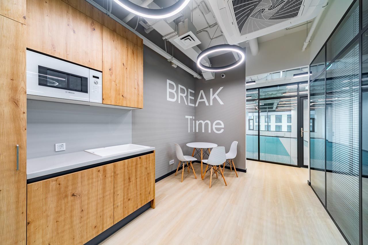 Помещение разделено на кабинеты перегородками с жалюзями, которые можно открывать или закрыть, есть общая кухня с холодильником и микроволновой печью.