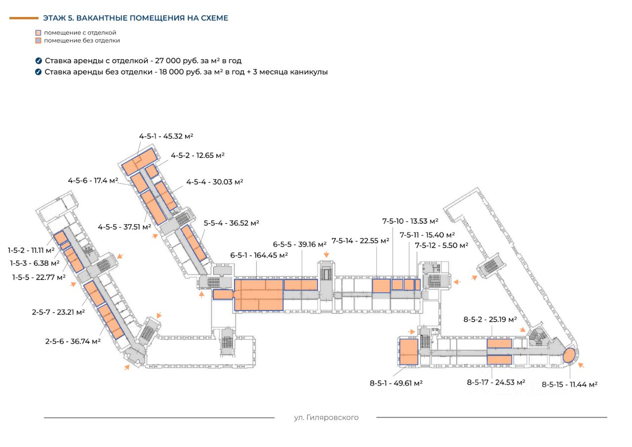 Предлагаются комфортные офисы класса В+ разного метража - 38 лотов от 25 кв.м (этажи 5, 3, 2 и 1).