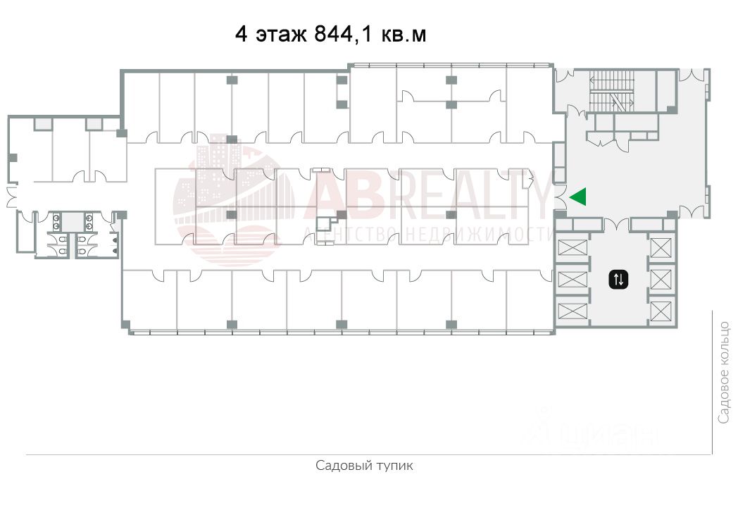 4 этаж. Офисный блок площадью 844 кв.м оснащен кухней и санузлами.