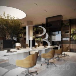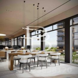 Общая площадь 263,08 кв.м. Расположен на 8 этаже. Панорамное остекление. Высота потолков составляет 3,75 м. В центре есть собственный дата-центр и мобильное приложение на платформе "СберМобайл"