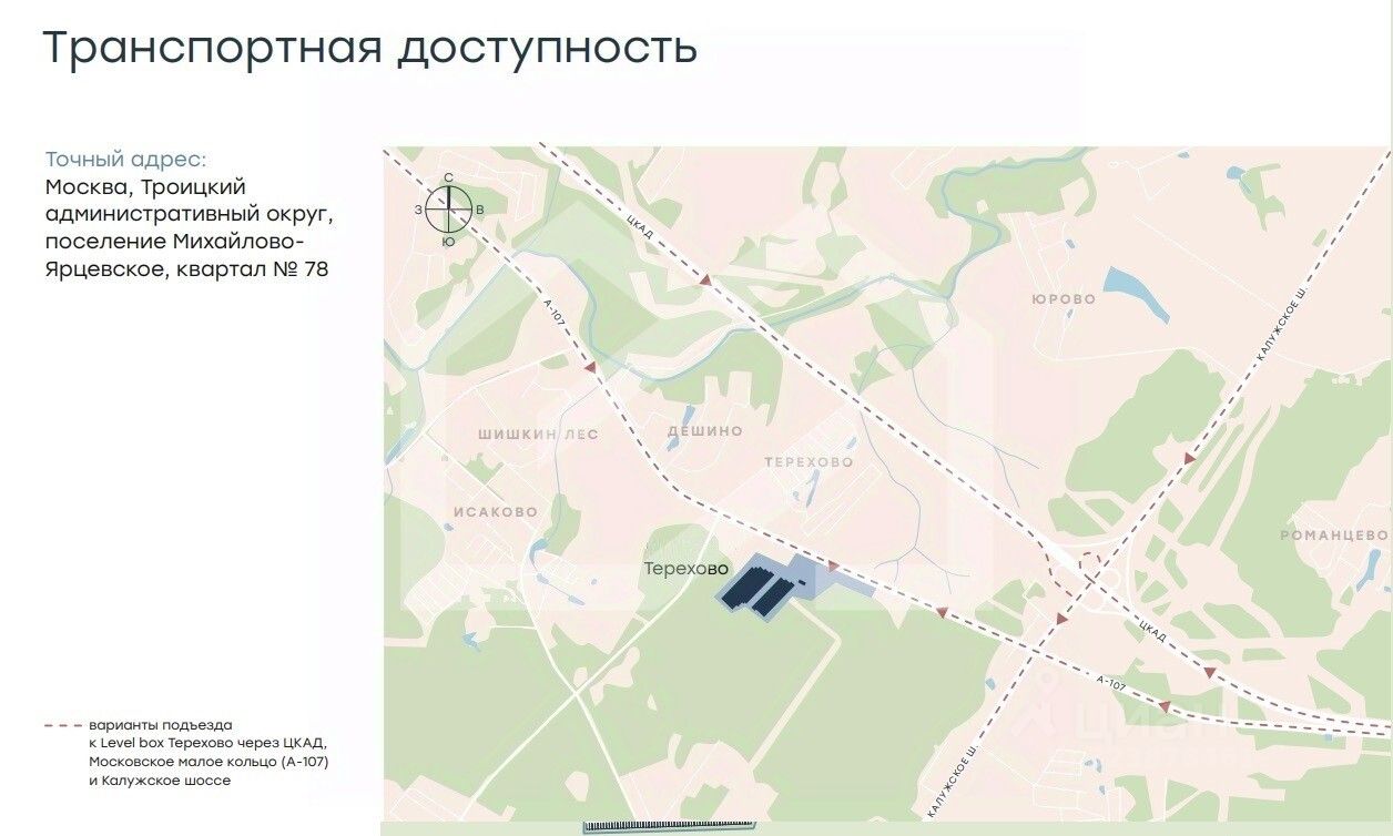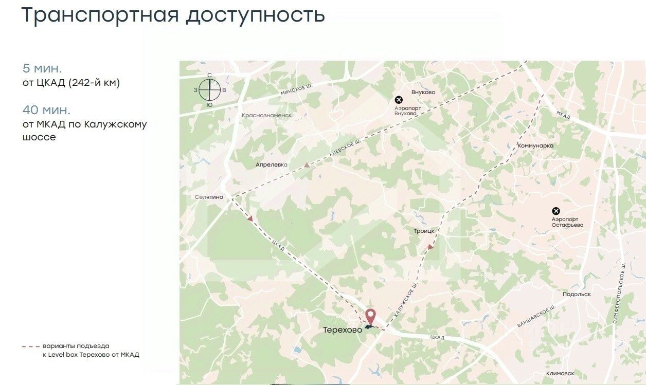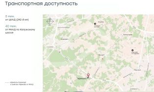 На пересечении Калужского шоссе (1.5 км) и ЦКАД (50 м), выезд на бетонку, 40 минут до МКАД.