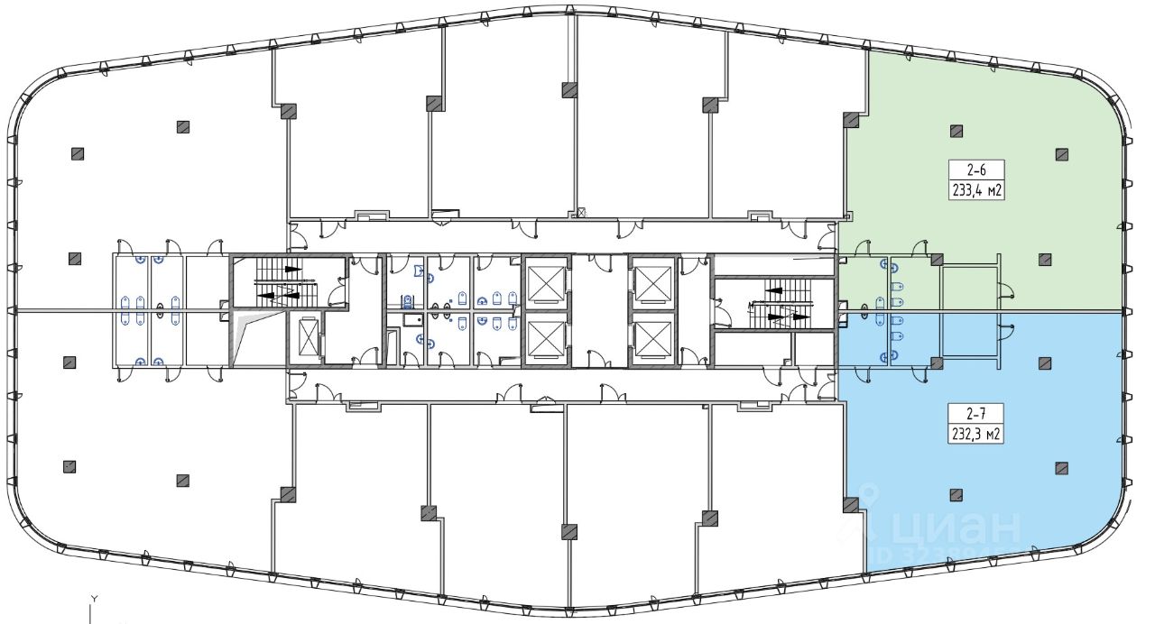 • Площадь: 465,7 м² (233,4 м² + 232,3 м²)