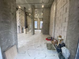 - Проведены 4 мокрые точки, сделана стяжка и выложена керамогранитная плитка матовый белый мрамор.
