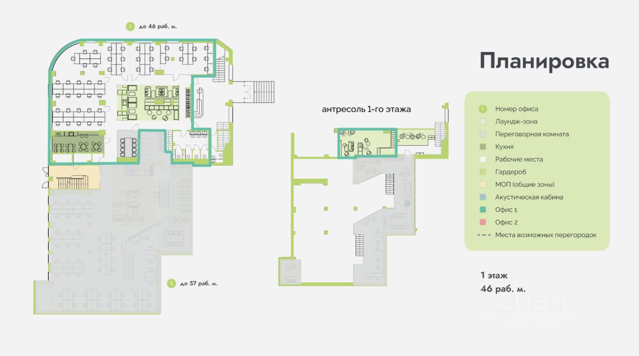 - Удобная планировка: открытое пространство с переговорной, кухней, лаундж-зоной и отдельными купе для общения.