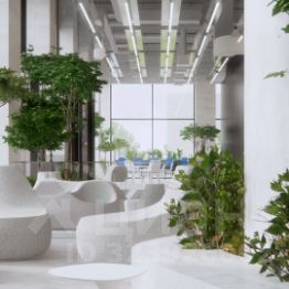 На каждом этаже есть переговорные комнаты. На верхнем этаже есть собственная терраса 216 м2. Конференц-зал на 105 мест.