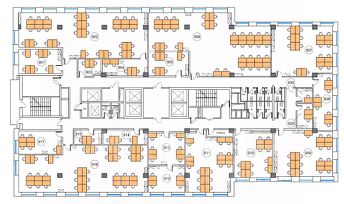На этаже общие зоны отдыха, кухня, ресепшн, сан. узлы и переговорные комнаты.