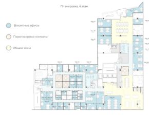 В местах общего пользования есть зона ресепшн и отдыха, оборудованная кухня, санузлы, переговорные комнаты.