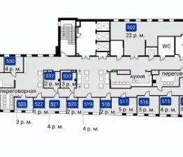 В блоке есть ресепшн, принт зона, зона отдыха и встречи гостей, переговорные комнаты, оборудованная кухня, санузлы.