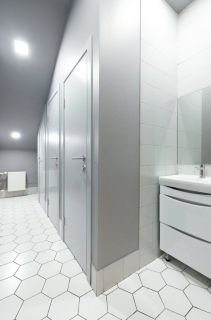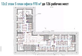 На этаже есть большая рабочая зона open space, отдельные кабинеты, 4 переговорные комнаты, кухня и собственные сан. узлы.