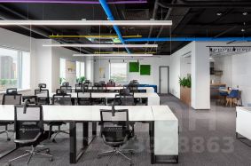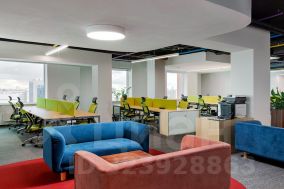 На этаже есть зона ресепшн, оборудованная кухня и зона приема пищи, зона отдыха и встречи гостей, санузлы и переговорные комнаты.