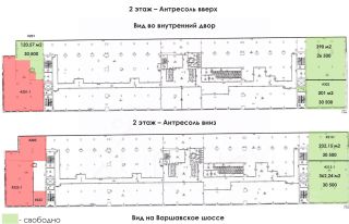 Антресоль 2-го этажа - два нижних блока - 362 м2 и 232 м2 и два верхних блока - 390 м2 и 201 м2.