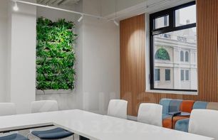 Есть зона ресепшн и отдыха, переговорные комнаты разного формата, кухня, гардеробная, сан. узлы.