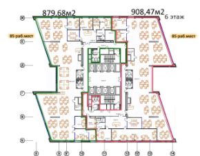 Рассадка на 85 рабочих мест. Есть рабочая зона open space, выделенные кабинеты, отдельный кабинет со своим санузлом и переговорной комнатой, общая кухня и санузлы для сотрудников. Готов к въезду.