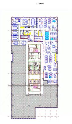 В блоке есть зона ресепшн и встречи гостей, переговорные комнаты, кухня и санузлы.