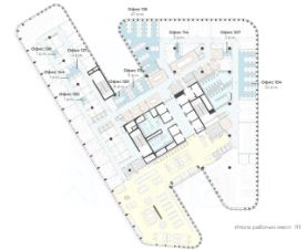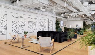 Общие зоны на этаже - ресепшн, переговорные комнаты, оборудованная кухня и зона приема пищи, гардеробная, мягкая зона отдыха.