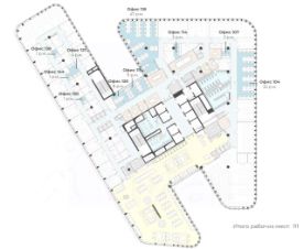 Общие зоны на этаже - ресепшн, переговорные комнаты, оборудованная кухня и зона приема пищи, гардеробная, мягкая зона отдыха.