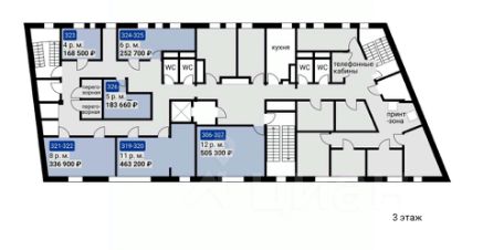 Описание помещения: Кабинет рассчитан на размещение 11 сотрудников. На этаже есть кухня, переговорные комнаты, принт-зона, телефонные кабины, сан. узлы.