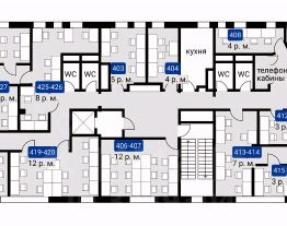 Рассчитан на размещение 79 рабочих мест. На этаже есть кухня, переговорные комнаты, принт-зона, телефонные кабины, сан. узлы.