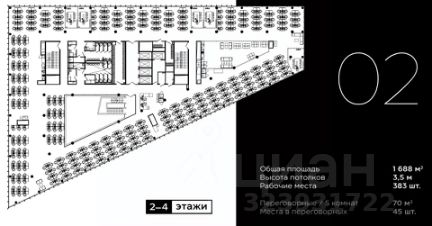 Описание помещения: Целиком этаж. Рассчитан на 383 рабочих места. Отделка и мебель выполняется под арендатора.