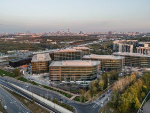 Бизнес-парк состоит из шести офисных зданий с фасадами из натурального базальта и металла, анодированного под бронзу. Архитектурный комплекс органично вписан в окружающий природный ландшафт, подчеркивая гармонию современного дизайна и естественной среды.