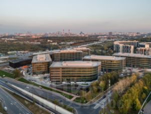 Бизнес-парк состоит из шести офисных зданий с фасадами из натурального базальта и металла, анодированного под бронзу. Архитектурный комплекс органично вписан в окружающий природный ландшафт, подчеркивая гармонию современного дизайна и естественной среды.