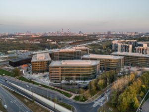 Бизнес-парк состоит из шести офисных зданий с фасадами из натурального базальта и металла, анодированного под бронзу. Архитектурный комплекс органично вписан в окружающий природный ландшафт, подчеркивая гармонию современного дизайна и естественной среды.