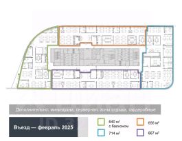 В блоке есть переговорные комнаты, несколько кабинетов, мини-кухня и зоны отдыха.