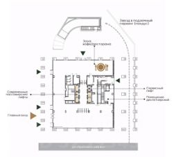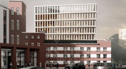 Девятиэтажное офисное здание аккуратно интегрировано в сформированную среду.