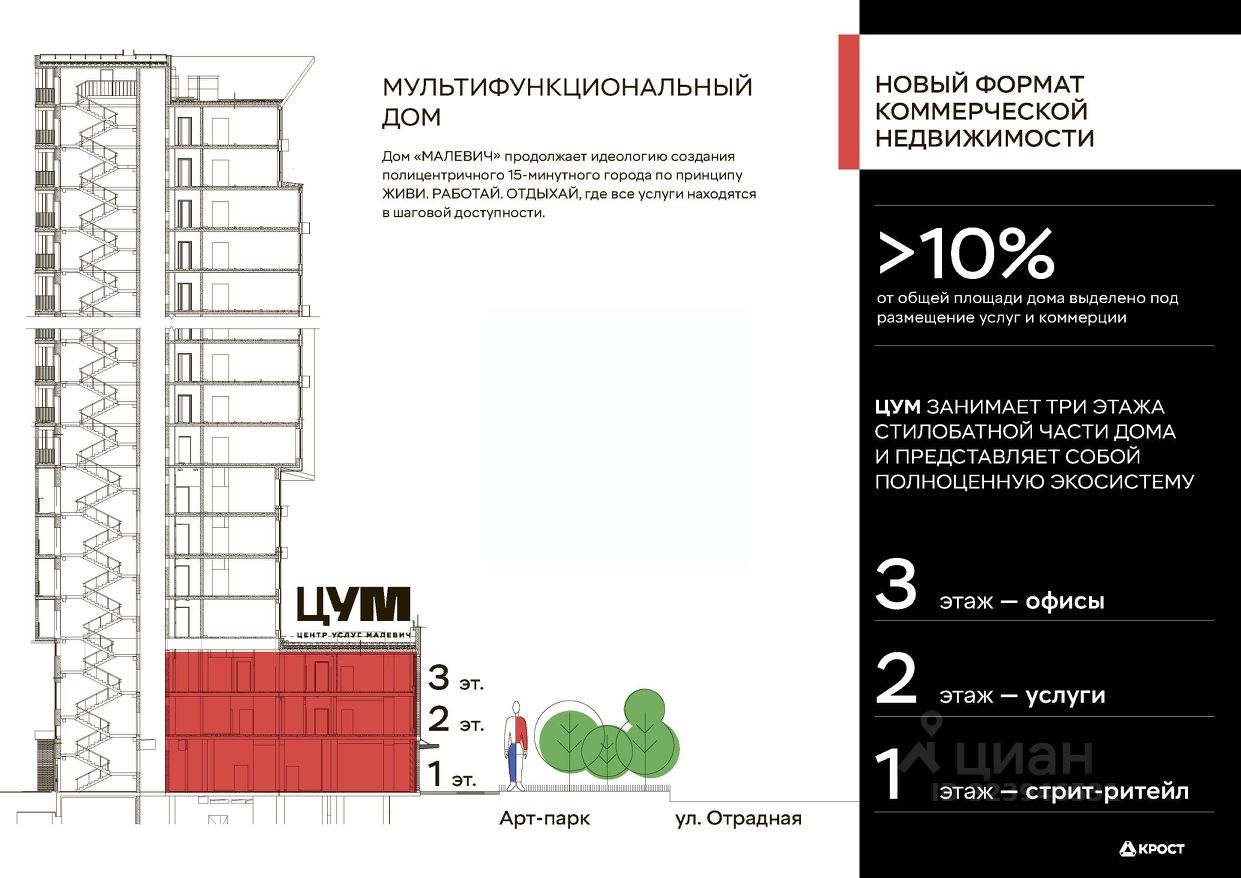 Аренда нежилого помещения площадью 86 кв.м от застройщика в уникальном проекте ЦУМ (Центр Услуг Малевич) - широкоформатный и мультифункциональный кластер услуг, интегрированный в жилое пространство Дома "МАЛЕВИЧ", который находится в сердце густонаселенного района Отрадное.