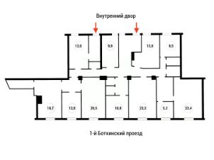 Помещение располагается на 1-м этаже 7-этажного жилого дома. Основной и дополнительный входы в помещение - со стороны двора. На фасад выходят окна 7 кабинетов. Также есть фасадная вывеска. Общая площадь помещения 232 м². В составе 11 кабинетов с отдельными окнами, 2 санузла, несколько технических помещений. В помещении выполнен качественный ремонт. Есть медицинская лицензия. Действующий арендатор (медицинская клиника) работает до конца ноября.