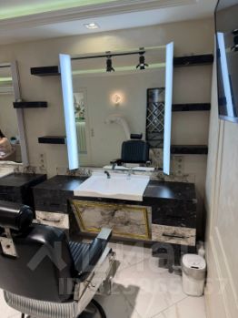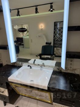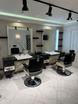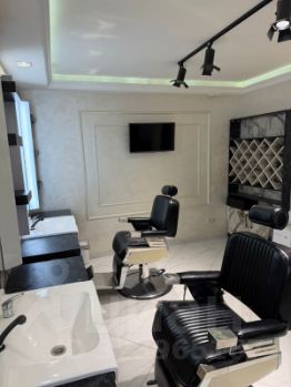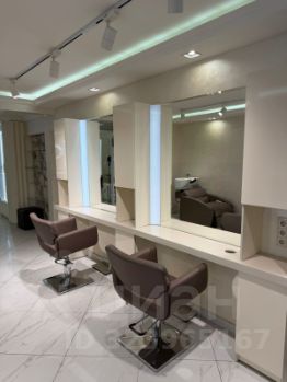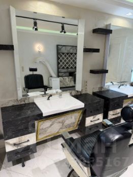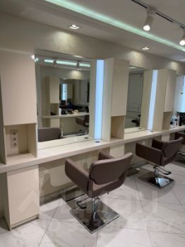 Парикмахерская зона — большие зеркала в полный рост, эргономичные кресла с регулировкой высоты, рабочие столы с профессиональным оборудованием, раковины с удобными смесителями.