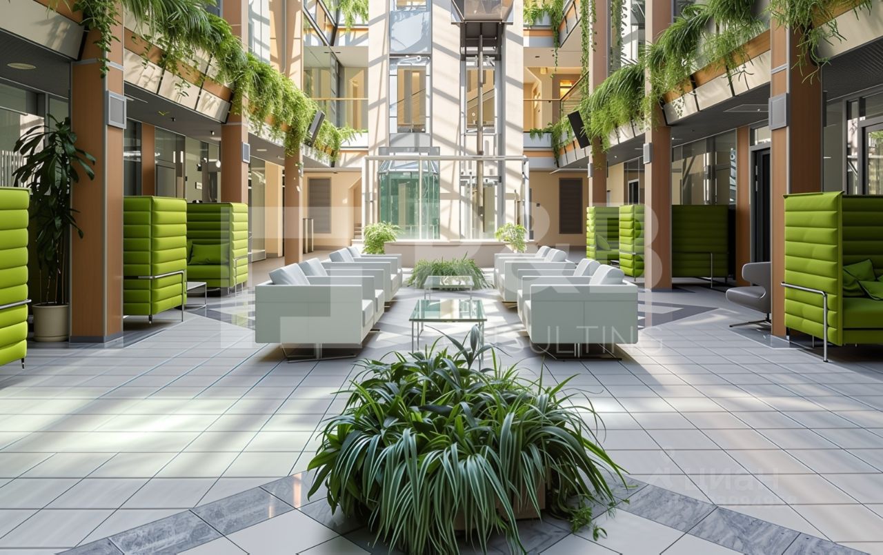 Атриум красивый с водопадом, в котором можно проводить корпоративные мероприятия, конференции . В здании есть своя мини столовая. Видовая эксплуатируемая кровля.