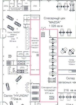Cтруктура: автосервис — 670 м² (включая зону прямой приёмки) + склад — 378 м² (трёхуровневый).