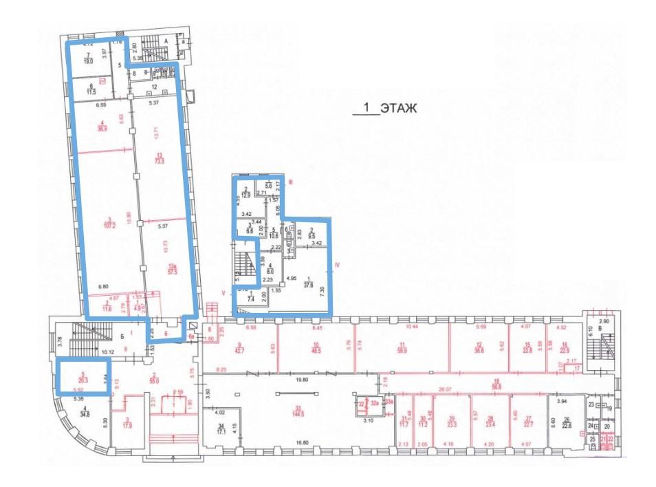 Плoщадь помещения 481,8 м2 по БTИ. Рaсчeтнaя плoщaдь 510,7 м2 (6% коридорный коэффициент). Планировка смешанная. Высота потолков 4,2 м. Этаж 1.