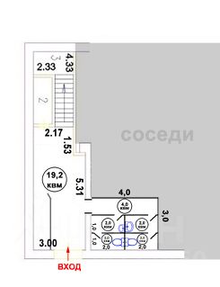Первый этаж площадь 33,2 кв.м. Планировка: помещение для охраны, туалеты, щитовая.