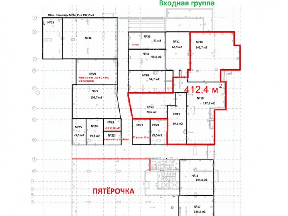 1-ый этаж жилого 10-этажного дома. Общая площадь 412,4 м², прикассовая зона супермаркета "Пятёрочка". Отдельный вход, витринное остекление, открытая планировка. Мощность электроэнергии 65 кВт. Высота потолков - 4 м.