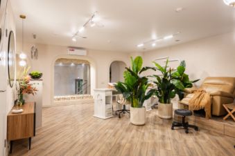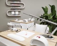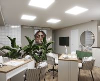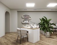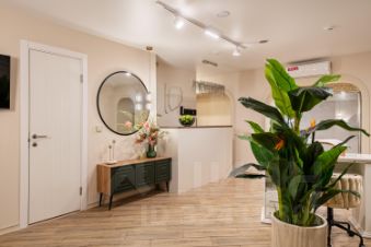 На этаже ниже расположены ещё два кабинета. Один из них оборудован под кабинет массажа. Второй свободного назначения. Во всей кабинетах висят большие зеркала. Рядом располагается зона стерилизации инструментов и индивидуальных шкафчиков локеров. Зона бровиста/ макияжа полностью оборудована.