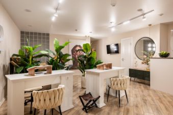 На первом этаже располагается зона ресепшна, обеденная зона, туалет, зона маникюра/ педикюра ( 2 стола и 2 реклайнера под педикюр), кабинет косметолога ( полностью оборудованный), кабинет лешмейкера (реклайнер специальный для наращивания ресниц). Во всех кабинетах огромные зеркала.