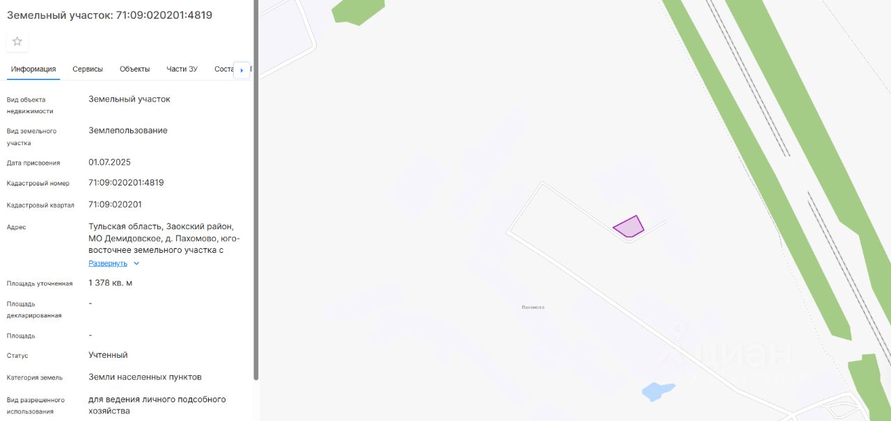 право заключения договора аренды земельного участка из земель населенных пунктов с кадастровым номером 71:09:020201:4819, площадь 1378 кв. м, местоположение: Тульская область, Заокский район, МО Демидовское, д. Пахомово, юго-восточнее земельного участка с кадастровым номером 71:09:020408:13, вид разрешенного использования: для ведения личного подсобного хозяйства.