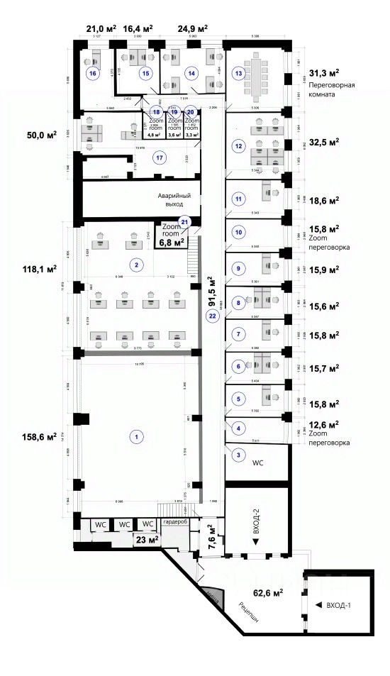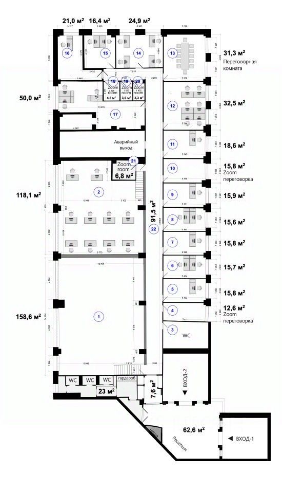- 2 оборудованных переговорных комнат (1 из них zoom переговорная)