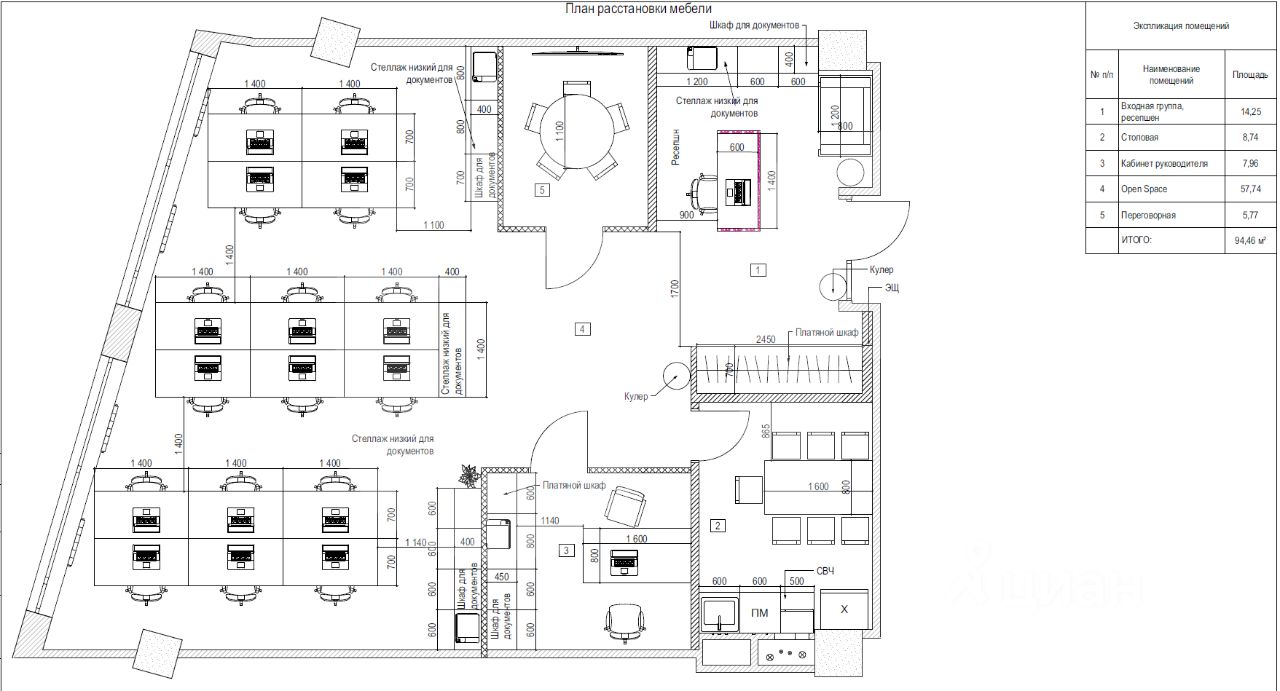 Планировка: ресепшен с зоной ожидания, рабочая зона на 16 мест, кабинет руководителя, переговорная, кухня.