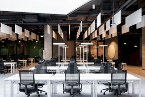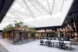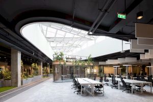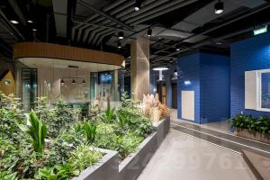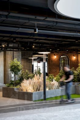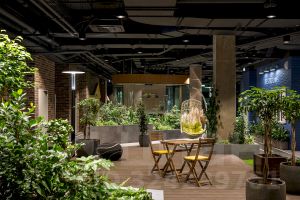 В настоящее время мы стремимся воссоздать и усилить уникальную атмосферу, которая царила в этом офисе ранее. Сейчас мы активно занимаемся озеленением общественных пространств и обновлением ключевых зон. Разрабатываем проекты рассадок сотрудников, устанавливаем дизайнерское освещение, создаем двухэтажные и индивидуальные переговорные комнаты, кофе поинты, столовые как для нашего коллектива, так и для арендаторов.