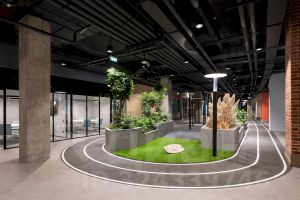 Парк окружён городом: более 40 переговорных комнат, санузлы, гардеробные и множество необычных помещений — библиотека, каминная, кофейня. Все они сделаны разными, как в реальном городе.