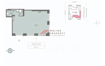 Помещение 80,3 м2 располагается на 1 этаже, открытая планировка, отдельный вход с фасада, высота потолка 4 м, витринные окна по фасаду. Электрическая мощность 16 кВт.