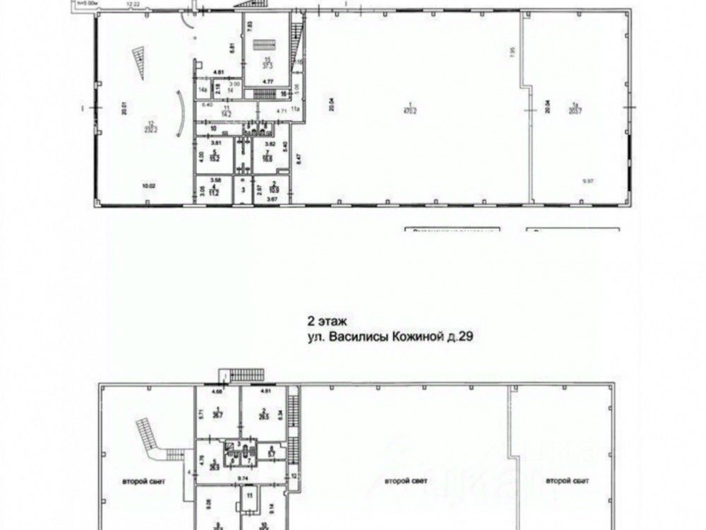 Второй этаж: Готовая офисная зона на 4 кабинета, рассчитанная на 15 рабочих мест. Высота потолков: 7 м.
