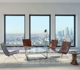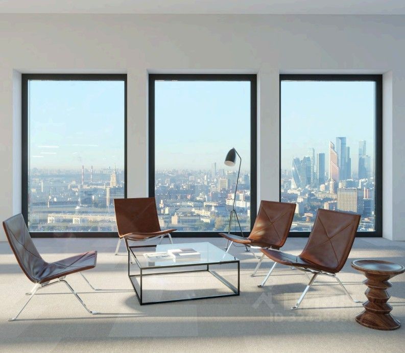 Естественный свет обеспечивает панорамное остекление с высокими потолками.
