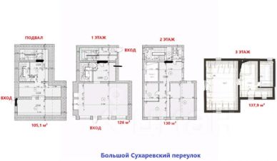 Предлагается в аренду здание в 4 уровня: подвал 105,1 м², 1й этаж 126 м², 2й этаж 130 м², мaнсapдный этаж 137,9 м². Открытая планировка, несколько входов и большие витрины обеспечивают максимальную гибкость использования.