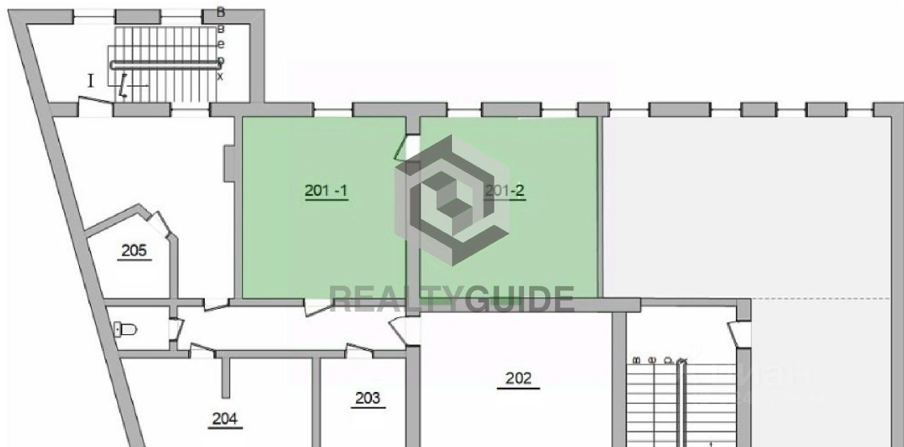 Офисное помещение состоит из двух кабинетов площадью 21,29 м2 и 25,96 м2.