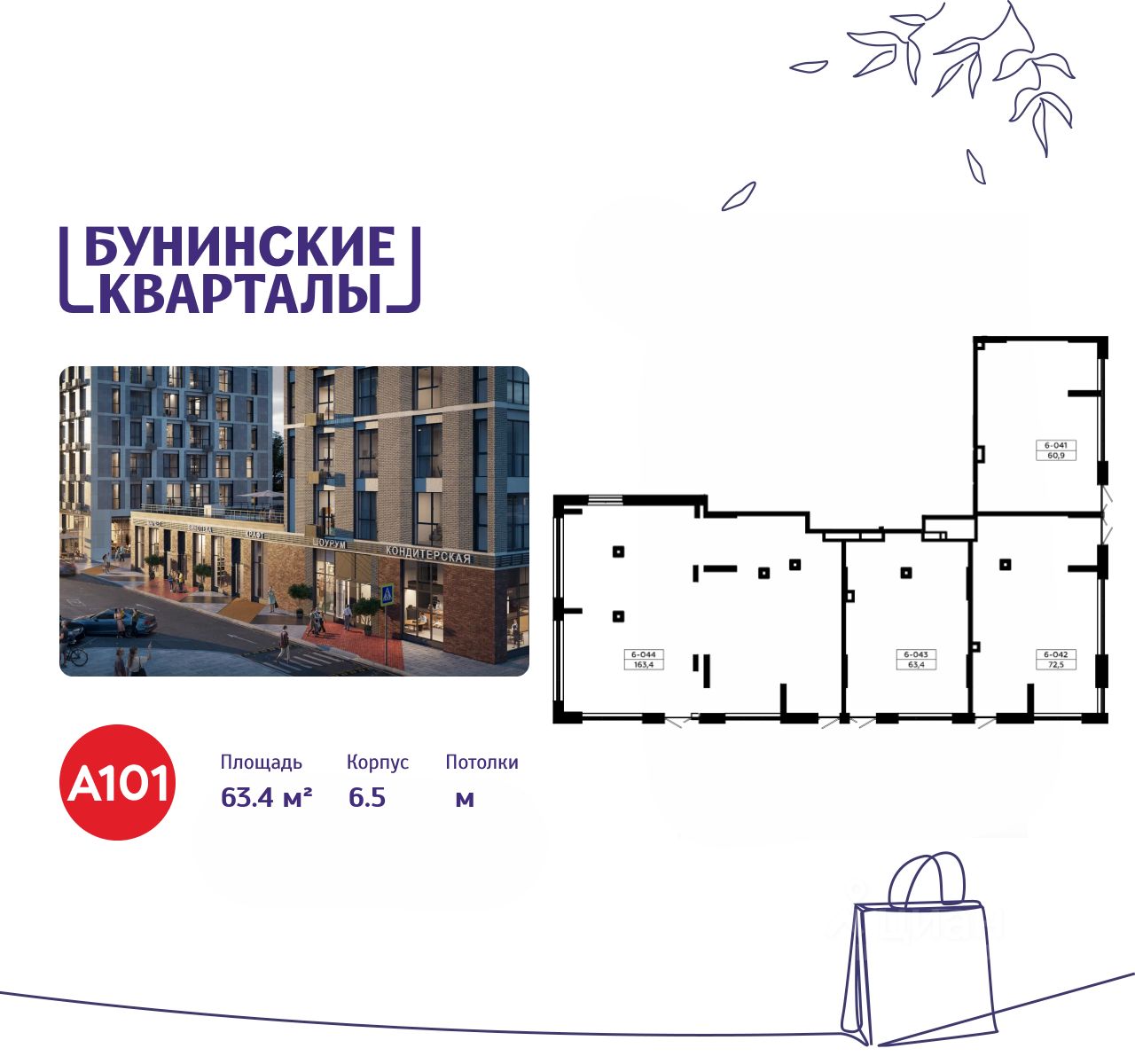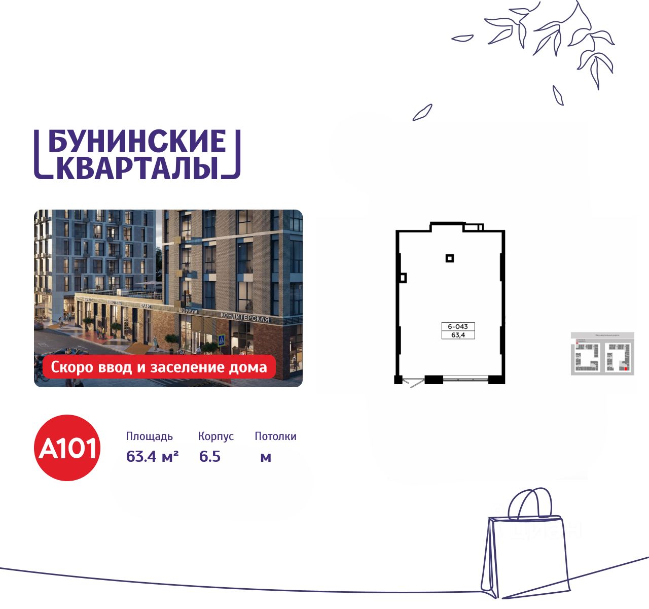 Сдается помещение площадью 63.40. на 1-м этаже ЖК "Бунинские кварталы".